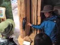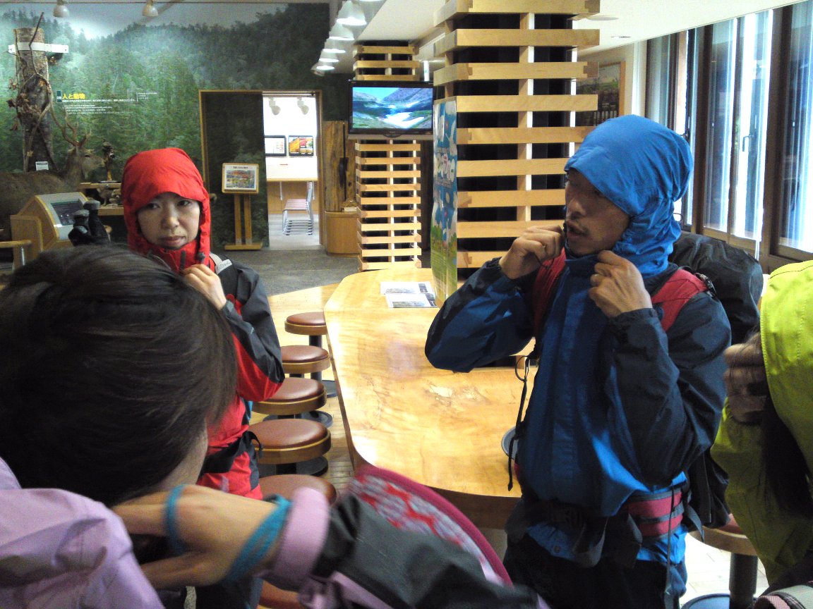 当初の予定を変更して、まずは層雲峡ビジターセンターにて、雨の登山のレクチャー、黒岳周辺の自然の講座。大雪山に多いアカエゾマツや、アカゲラなど、動植物に関するお話です。