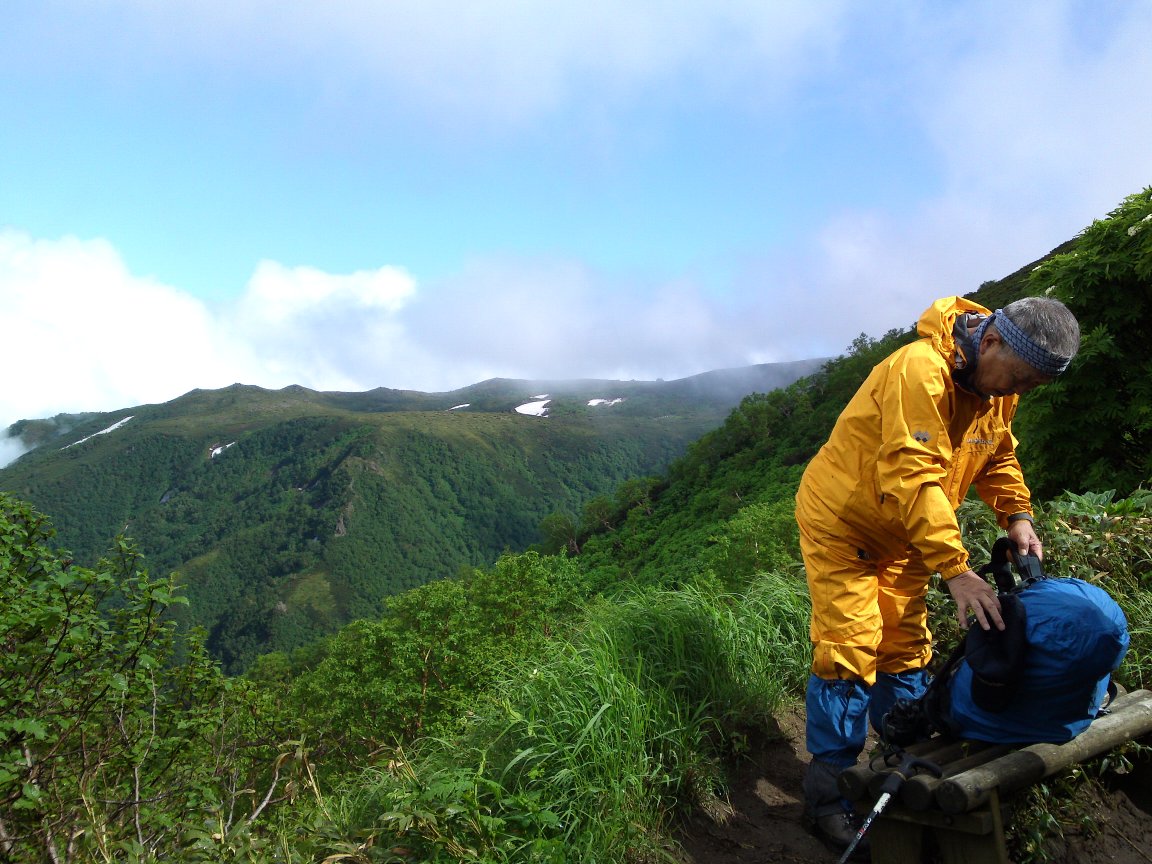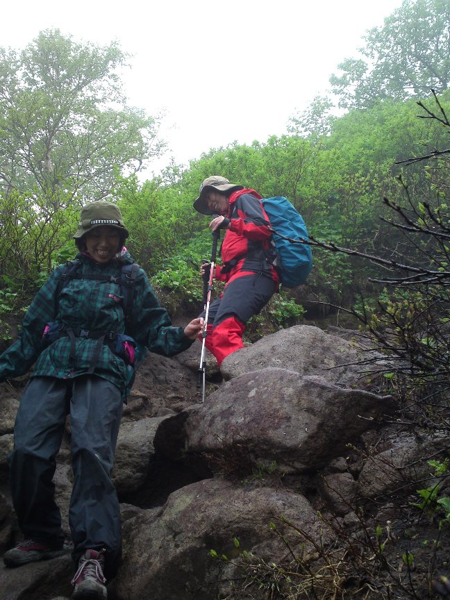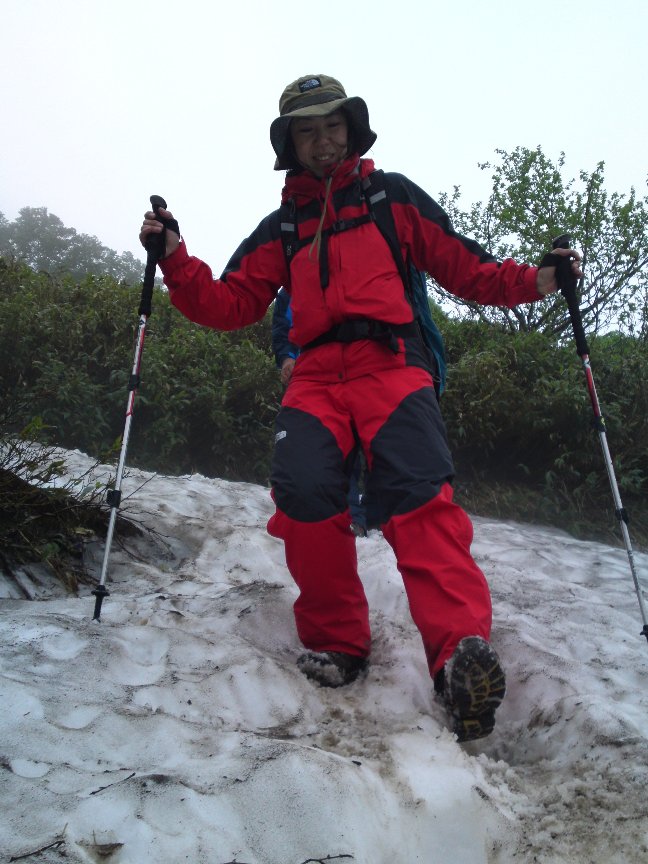 雨水と雪解け水の流れる沢のような登山道を登り、