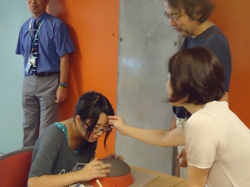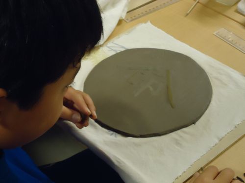 中には重いテーマも、「命」という文字をお皿に粘土付けしている生徒さんの作品です。