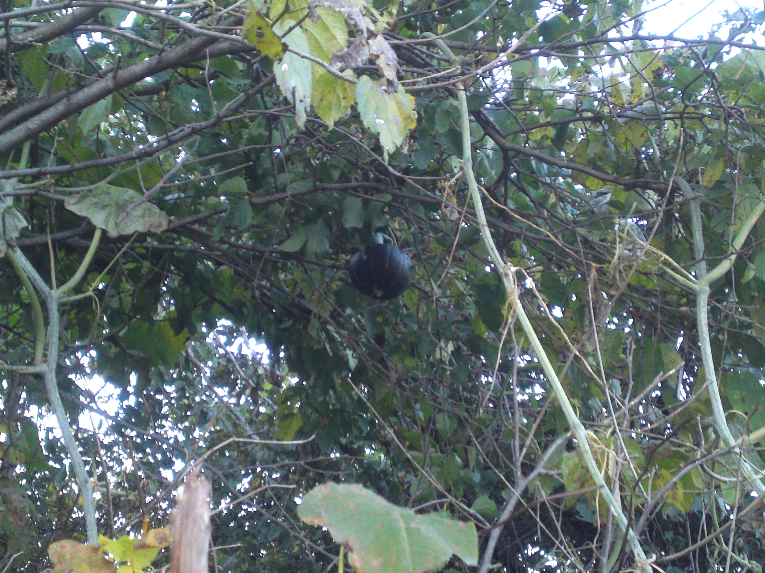 そうして蔓が伸び、しまいには裏の木へ。気がつくと、あんなところにカボチャを実らせてしまったわけです。